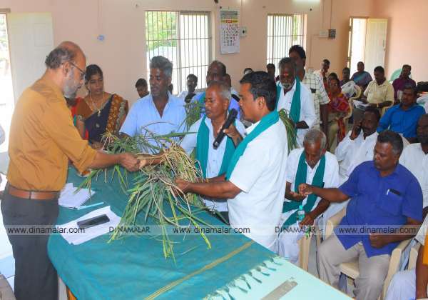 விருத்தாச்சலம் ஆர்.டி.ஓ. அலுவலகத்தில் நடந்த குறைதீர் கூட்டத்துக்கு மழை வெள்ளத்தால் பாதிக்கப்பட்ட நெற்பயிர்களுடன் வந்த விவசாயிகள்.