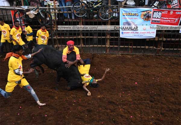 பொங்கல் திருநாளில் மதுரை மாவட்டம் அவனியாபுரத்தில் புகழ்பெற்ற ஜல்லிக்கட்டு போட்டியில் மாடுகளை அடக்கும் வீரர்கள்.