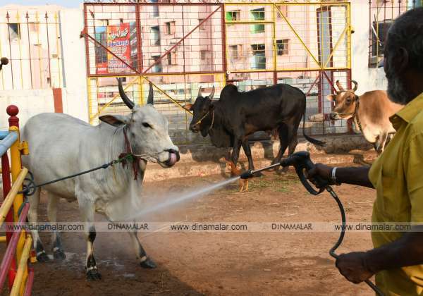 மாட்டுப் பொங்கலை முன்னிட்டு திருப்பூர், செல்லாண்டியம்மன் கோவில் வளாகத்தில் மாடுகளை குளிக்க வைத்தனர்.