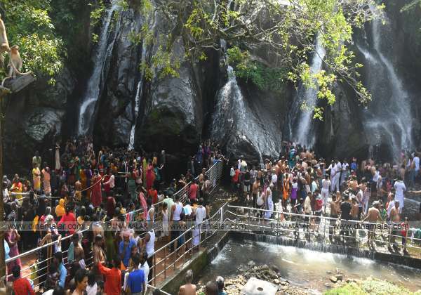 தொடர் விடுமுறை என்பதால் தென்காசி மாவட்டம் குற்றாலம் ஐந்தருவியில் குளிக்க குவிந்த சுற்றுலா பயணிகள்.