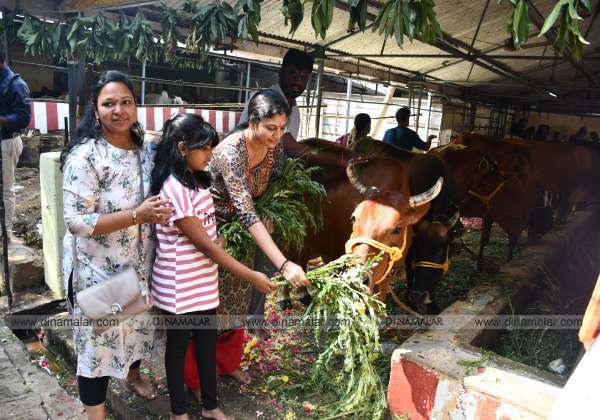 மாட்டுப் பொங்கலை முன்னிட்டு, சென்னை மேற்கு மாம்பலத்தில் உள்ள கோசாலையில் உள்ள பசுக்களுக்கு பூஜை செய்து உணவளித்த மக்கள்.