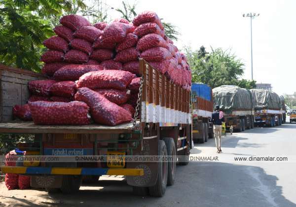மகாராஷ்டிரா மற்றும் கர்நாடகாவில் இருந்து கொண்டு வரப்பட்டு, இறக்க இடமில்லாததால், திருப்பூர் தென்னம்பாளையம் மார்கெட் வெளியே வரிசையாக நிறுத்தி வைக்கப்பட்டுள்ள பெரிய வெங்காயம் ஏற்றி வந்த லாரிகள்.