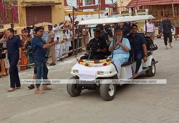 பிரதமர் மோடி ராமேஸ்வரம் அக்னி தீர்த்தம் கடற்கரையில் புனித நீராடி விட்டு சுவாமி தரிசனம் செய்ய ராமநாதசுவாமி கோயிலுக்கு பேட்டரி காரில் சென்றார்.