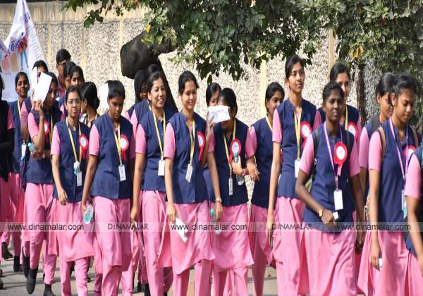 தேசிய வாக்காளர் தினத்தை முன்னிட்டு கோவை கலெக்டர் அலுவலகத்திலிருந்து விழிப்புணர்வு பேரணியில் கலந்து கொண்ட மாணவிகள்.