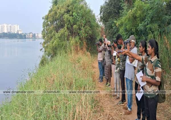 வனத்துறை சார்பில் கோவையிலுள்ள குளங்களில் பறவைகள் கணக்கெடுப்பு நடந்தது. இடம்: சிங்காநல்லூர் குளம்.