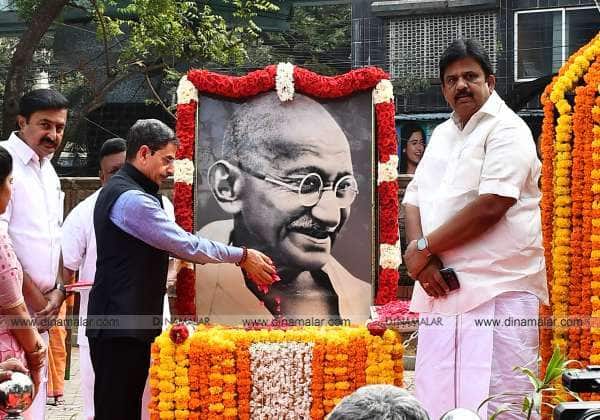 மஹாத்மா காந்தி நினைவு தினத்தை முன்னிட்டு சென்னை எழும்பூர் அரசு அருங்காட்சியகத்தில் அவரது சிலைக்கு அருகே அலங்கரித்து வைக்கப்பட்டிருந்த உருவ படத்திற்கு கவர்னர் ரவி மலர்தூவி மரியாதை செலுத்தினார். உடன் அமைச்சர் சாமிநாதன் சென்னை மாநகராட்சி துணை மேயர் மகேஷ்குமார்.