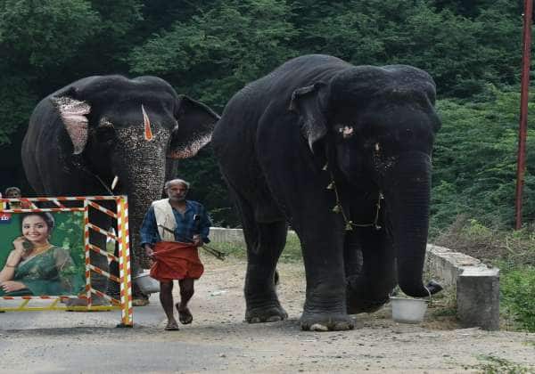 தூத்துக்குடி மாவட்டம் ஆழ்வார்திருநகரி பகுதியில் உள்ள கோவில்களில் உள்ள யானைகள் தாமிரபரணி ஆற்றில் குளித்துவிட்டு ஒய்யாரமாக நடந்துவருகிறது..