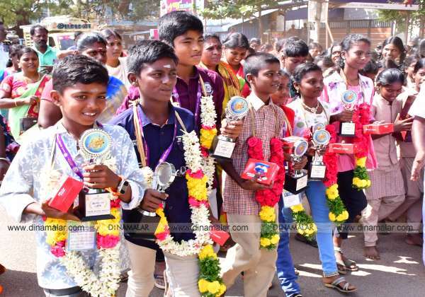 மாநில அளவிலான கலைத்திருவிழா போட்டியில் இரண்டாம் இடம் பிடித்த சிவகங்கை அருகே காஞ்சிரங்கால் ஊராட்சி ஒன்றிய நடுநிலைப்பள்ளி மாணவர்களை கிராமமக்கள் வரவேற்றனர்.