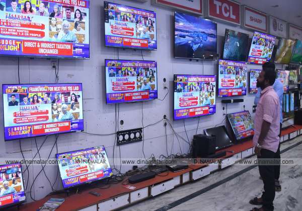 மத்திய பட்ஜெட் தாக்கல் செய்யப்பட்டதை தொலைக்காட்சியில் ஆர்வமுடன் பார்வையிட்ட வாடிக்கையாளர்கள்.இடம்: திருநெல்வேலி.