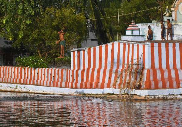 தென்காசி மாவட்டம் ஆழ்வார்குறிச்சி பகுதியில் உள்ள குளத்தில் உற்சாக குளியல் போடும் சிறுவர்கள்.