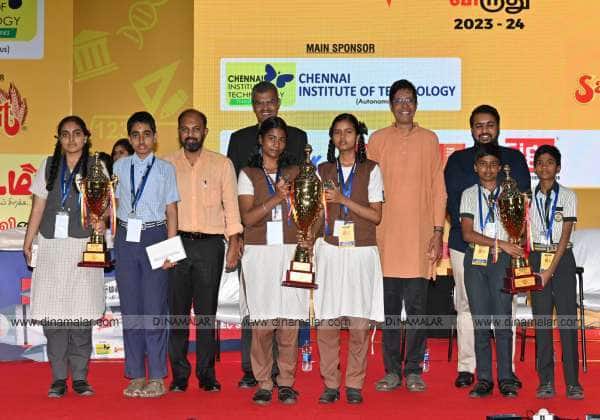 தினமலர் மாணவர் பதிப்பான பட்டம் இதழின் சார்பாக நடைபெற்ற வினாடி வினா இறுதிப் போட்டியில் வெற்றி பெற்று முதல் இரண்டாவது மூன்றாவது இடத்தைப் பெற்ற மாணவ மாணவியர்களுடன் விருந்தினர்கள்