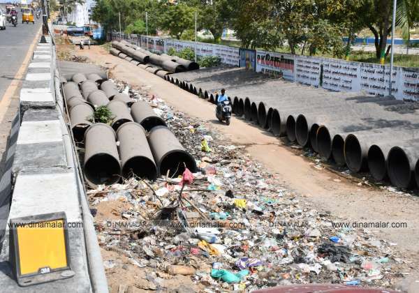 சென்னை ரெட்டேரி மேம்பாலத்தின் சர்வீஸ் சாலையில் இருபுறமும் போக்குவரத்திற்கு இடையூறாக வைக்கப்பட்டுள்ள ராட்சத குழாய்கள். இடம் : கொளத்தூர்