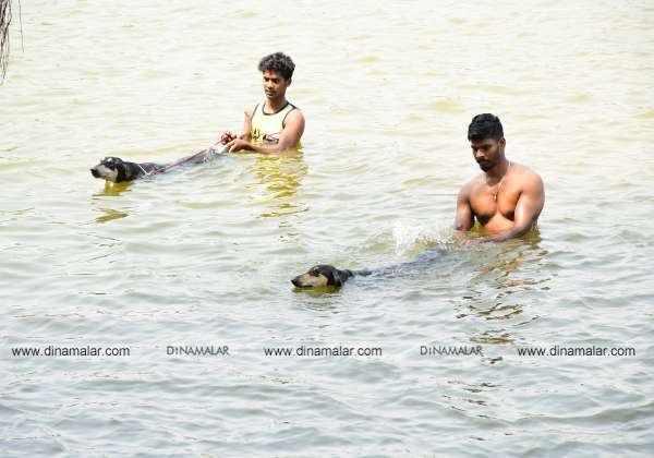 கோவை பேரூர் அருகே உள்ள புது குளத்தில் வேட்டை நாய்களுக்கு நீச்சல் பயிற்சி அளிக்கப்பட்டது.