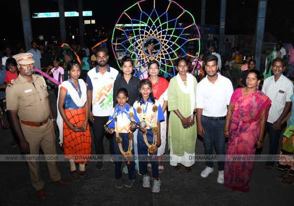 தேசிய அளவில் நடந்த கேலோ இந்தியா போட்டியில் மல்லர் கம்பத்தில் வெள்ளி பதக்கம் பெற்ற விழுப்புரம் மாணவிகள் மதிவதனி, பூமிக்கா இருவரையும், மல்லர் கம்பம் அகாடமி நிர்வாகிகள் ஊர்வலமாக அழைத்து சென்றனர்.