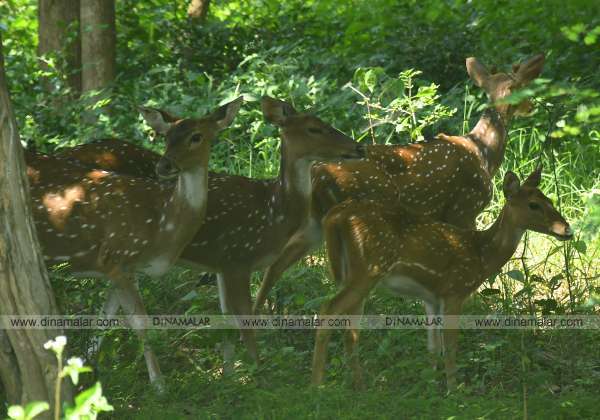 திருநெல்வேலி மாவட்டம் பாபநாசம் வனப்பகுதியில் இரை தேடி சுற்றித்திரியும் புள்ளி மான்கள்.