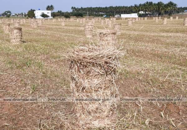 மாட்டு தீவனத்திற்க்காக விவசாயிகள் அறுவடை செய்யப்பட்ட மக்கச்சோள தட்டுகளை பேரல் பேரலாக கட்டி வைக்கப்பட்டு உள்ளன. இடம்.உடுமலை பெரியகோட்டை