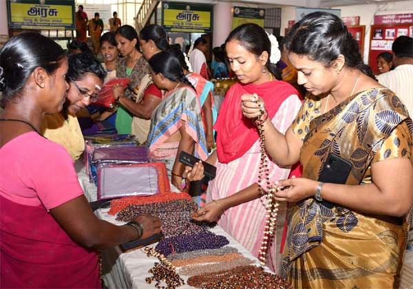 திருவண்ணாமலை கலெக்டர் அலுவலக வளாகத்தில், மகளிர் சுய உதவிக் குழுவினர் உற்பத்தி பொருள் கண்காட்சியை ஆர்வத்துடன் பார்த்த அரசு அலுவலர்கள் மற்றும் பொதுமக்கள்.