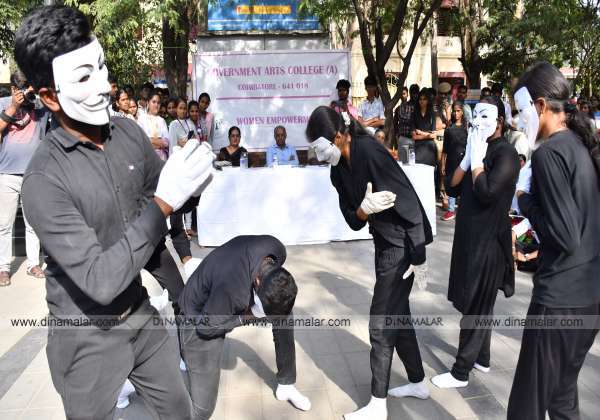 பெண் வன்கொடுமை தடுப்பது குறித்த தெரு நாடகம் கோவை ரேஸ்கோர்ஸ் பகுதியில் கோவை அரசு கலை கல்லூரி மாணவ, மாணவிகள் சார்பில் நடந்தது.