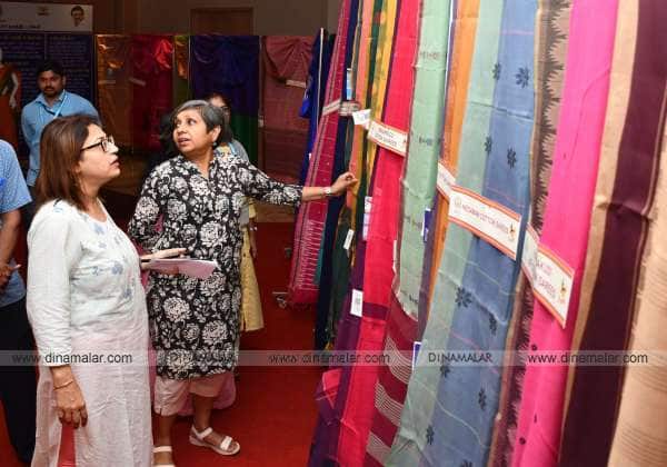 கைத்தறி துணிநூல் துறை சார்பில் நடந்த வாங்கல் மற்றும் விற்பனை சந்திப்பு நிகழ்ச்சியில் இடம்பெற்ற சேலைகளை பார்வையிடும் பெண்கள். இடம் : தேனாம்பேட்டை