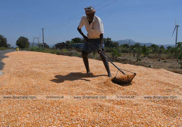 தேனி அருகே வெங்கடாசலபுரத்தில் ரோட்டில் மக்காசோளத்தை வெயிலில் உலர்த்தும் பணியில் ஈடுபட்ட விவசாயி.