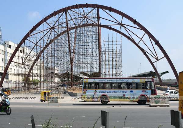 கிளாம்பாக்கம் பஸ் நிலையத்தில் மாநகர பேருந்து நிறுத்தம் நுழைவு வாயிலில் மிகப்பிரமாண்ட அளவில் வளைவு அமைக்கப்பட்டு வருகிறது