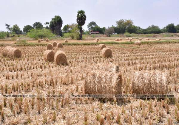 சிவகங்கை அருகே பனையூர் பகுதியில் இயந்திரம் மூலம் அறுவடை செய்யப்பட்ட வைக்கோல் பந்துகள்.