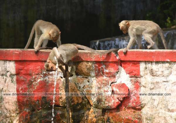 வெயிலின் தாக்கம் அதிகரித்து காணப்படுவதால் தண்ணீர் குழாயில் நீர் அருந்தி தாகத்தை தீர்த்து கொள்ளும் குரங்குகள்.இடம்: காரையார், திருநெல்வேலி மாவட்டம்.