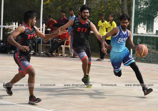கோவை சத்தி ரோடு எஸ்.என்.எஸ்., தொழில்நுட்பக் கல்லூரி மைதானத்தில் நடந்த கூடைப்பந்து போட்டியில் சீறிப்பாய்ந்து விளையாடிய வீரர்.