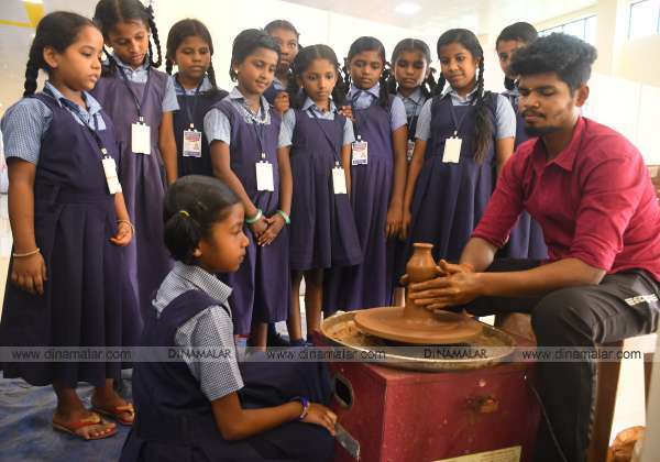 7வது பொருநை நெல்லை புத்தக கண்காட்சிக்கு வரும் மாணவ - மாணவியர்களுக்கு மண் பானைகளை செய்து காட்டிய இளைஞர். இடம்: திருநெல்வேலி, வர்த்தக மையம்