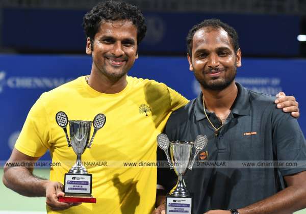 சென்னையில் நடந்த சேலஞ்சர் கோப்பை டென்னிஸ் போட்டியில் நேற்று நடந்த இரட்டையர் ஆட்டத்தில் வெற்றிபெற்ற இந்திய வீரர்கள் ராம்குமார் ராமநாதன் மற்றும் சகேத் மைநேனி.இடம் : நுங்கம்பாக்கம்.