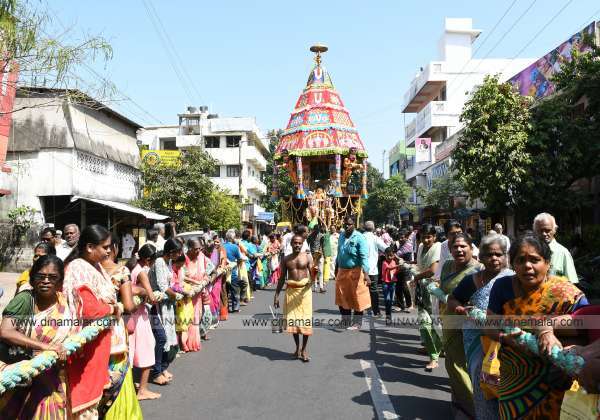 புதுச்சேரி காந்திவீதி முத்தியால்பேட்டையில் உள்ள தென்கலை ஸ்ரீ சீனிவாச பெருமாள் கோவில் பிரம்மோற்சவத்தை முன்னிட்டு 40 அடி உயர தேர் வீதி உலா நடந்தது.