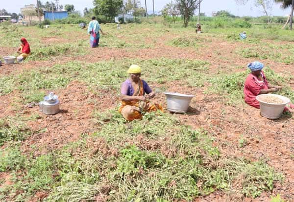 கொளுத்தும் வெயிலையும் பொறுப்படுத்தாமல் அறுவடை செய்யப்பட்ட வேர்க்கடலை பிரிக்கும் பணியில் ஈடுபட்டுள்ள பெண்கள். இடம்: திருவண்ணாமலை.