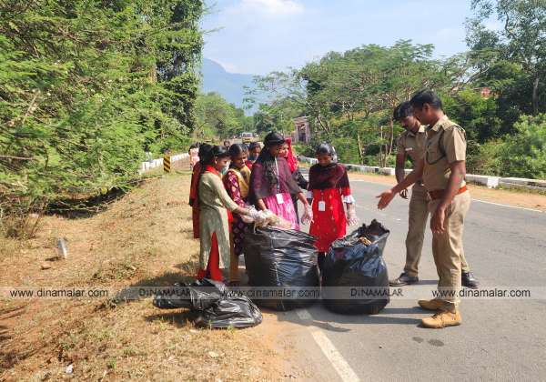மேட்டுப்பாளையம் வன சரகத்திற்கு உட்பட்ட கோத்தகிரி சாலையில் ரோட்டோரம் வீசப்பட்ட மது பாட்டில்கள் மற்றும் குப்பைகளை விஎம்கே மகளிர் அறிவியல் கல்லூரியை சேர்ந்த மாணவிகள் அகற்றினர். அருகில் வன சரக அலுவலர் ஜோசப் ஸ்டாலின் .