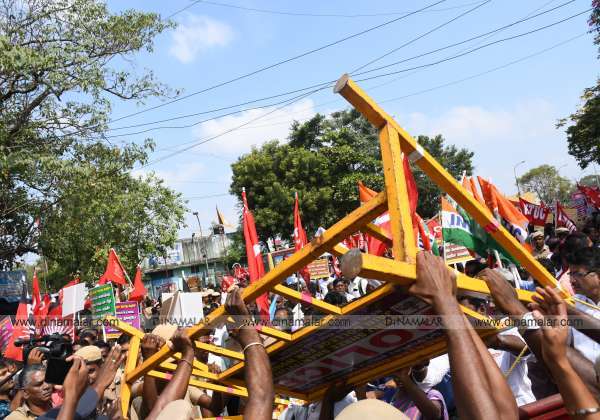 டேம்ஸ் சாலையை மறைத்து மத்திய தொழிற்சங்கங்களின் கூட்டமைப்பு சார்பில் ஆர்ப்பாட்டம் நடந்தது, போராட்டக்காரர்கள் போலீஸ்காரர்களுக்கும் இடையே தள்ளுமுள்ளு ஏற்பட்டது.இடம்: அண்ணா சாலை, சென்னை.