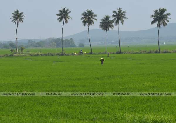 பசுமை போர்த்திய நெற்பயிர்களுக்கு அழகு சேர்க்கும் வண்ணம் கம்பீரமாக காட்சியளிக்கும் தென்னை மரங்கள். இடம் : வீரபாண்டி.