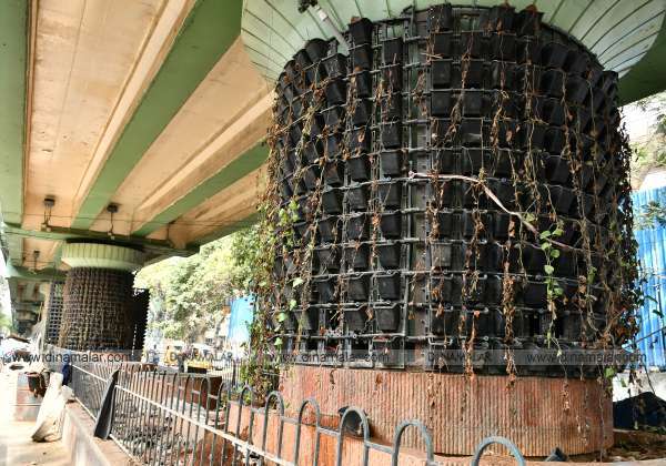சென்னை ராயப்பேட்டை மேம்பாலம் தூண்களில் அமைக்கப்பட்ட சுவர் பூங்கா செடிகள் பராமரிப்பு இல்லாமல் கருகிய நிலையில் உள்ளன.