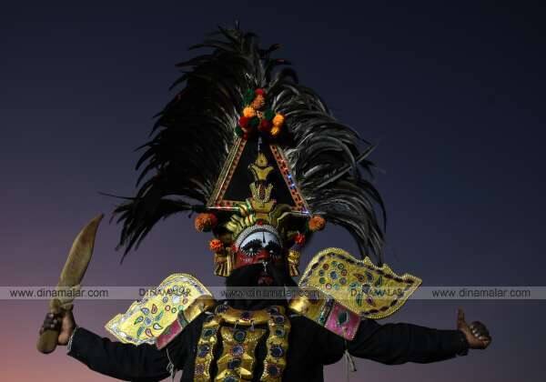 ஹிமாச்சல பிரதேசத்தில் நடந்து வரும் சர்வதேச தசரா விழாவில் அம்மாநிலத்தின் நாட்டி என்ற பாரம்பரிய நடனமாடி அசத்திய நடன கலைஞர்கள். இடம்: குலு.