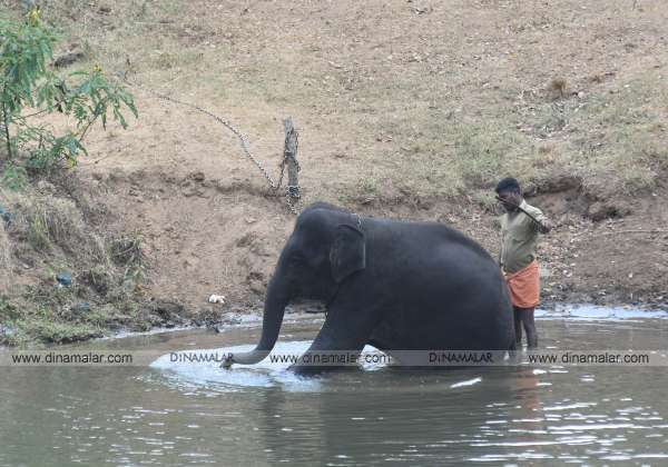 முதுமலை புலிகள் காப்பாக முகாம் யானை ரகுவை, தெப்பகாடு பகுதி மாயாற்றில் குளிப்பாட்டுகின்றனர்.