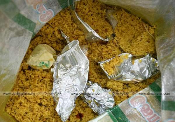 சென்னை தியாகராஜ சுவாமி கோவில் வளாகத்தில் தனியார் பிரசாதம் விற்பனை செய்யும் கடையில், விற்பனைக்காக வைக்கப்பட்டிருந்த கெட்டுப் போன புளியோதரை. இடம். திருவொற்றியூர்.