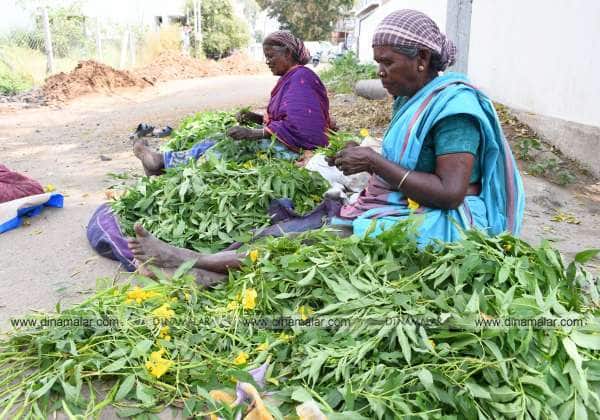 பூக்களோடு சேர்த்து கட்டுவதற்க்காக மஞ்சள் பூ அரளி இலைகளை தரம் பிரிக்கும் தொழிலாளர்கள்.இடம். உடுமலை