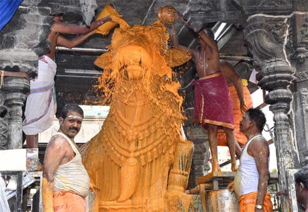 திருவண்ணாமலை அருணாசலேஸ்வரர் கோயிலில், மாசி மாத வளர்பிறை பிரதோஷத்தை முன்னிட்டு, ராஜகோபுரம் அருகே உள்ள பெரிய நந்திய பகவானுக்கு சந்தன அபிஷேகம் நடந்தது.