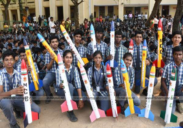 எம்.சி.சி பள்ளி வளாகத்தில் ராக்கெட் தொழில்நுட்ப செய்முறை பயிற்சி பெற்ற மாணவர்கள் 15 ராக்கெட்களை விண்ணில் செலுத்தினர். இடம் : சேத்துப்பட்டு, சென்னை.