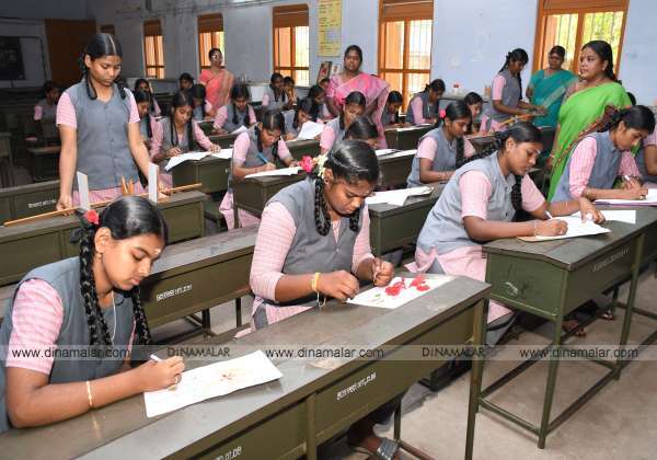 உடுமலை பாரதியார் நூற்றாண்டு அரசு பெண்கள் மேல்நிலைப் பள்ளியில் 10ம் வகுப்பு அறிவியல் பாட செய்முறை அரசு பொது தேர்வு எழுதும் மாணவியர்கள்.