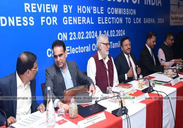 லோக்சபா தேர்தலுக்கான ஆயத்த பணிகள் குறித்த ஆய்வு கூட்டத்தில் கலந்து கொண்ட தலைமை தேர்தல் ஆணையர் ராஜீவ்குமார் மற்றும் தமிழக தலைமை தேர்தல் அதிகாரி சத்யபிரதசாஹூ . இடம் : மீனம்பாக்கம்