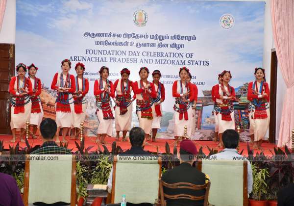 அருணாச்சல பிரதேசம் மற்றும் மிசோரம் மாநிலங்கள் உருவான தின விழா சென்னை கவர்னர் மாளிகையில் நடந்தது. இவ்விழாவில் தங்கள் பாரம்பரிய நடனமாடிய அருணாச்சல பிரதேச மாநில கலைஞர்கள். இடம் : கிண்டி