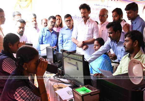 கோவை காளப்பட்டி அரசு மேல்நிலைப்பள்ளியில் பள்ளியிலேயே ஆதார் பதிவு செய்யும் முகாமினை பள்ளிக்கல்வித்துறை அமைச்சர் அன்பில் மகேஷ் பொய்யாமொழி தொடங்கி வைத்து பார்வையிட்டார் அருகில் பள்ளிக்கல்வித்துறை செயலாளர் குமரகுருபரன்.