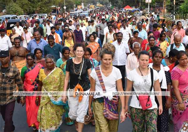 திருவண்ணாமலையில், மாசி மாத பௌர்ணமியை முன்னிட்டு, வெளிநாட்டு பக்தர்கள் உட்பட ஏராளமான பக்தர்கள் கிரிவலம் சென்றனர்.