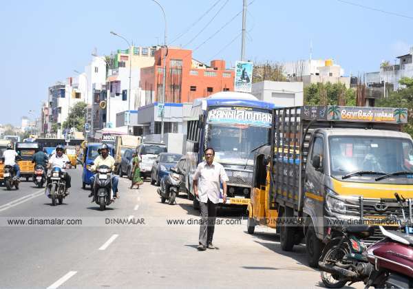 சென்னை தண்டையார்பேட்டை மெட்ரோ ரயில் நிலையம் அருகே திருவொற்றியூர் நெடுஞ்சாலையை ஆக்கிரமித்து நிறுத்தி வைக்கப்பட்டிருக்கும் வாகனங்கள்.