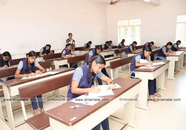 உடுமலை விசாலாட்சி பெண்கள் மேல்நிலைப் பள்ளியில் பிளஸ் 2 தமிழ் தேர்வு எழுதும் மாணவியர்கள் .