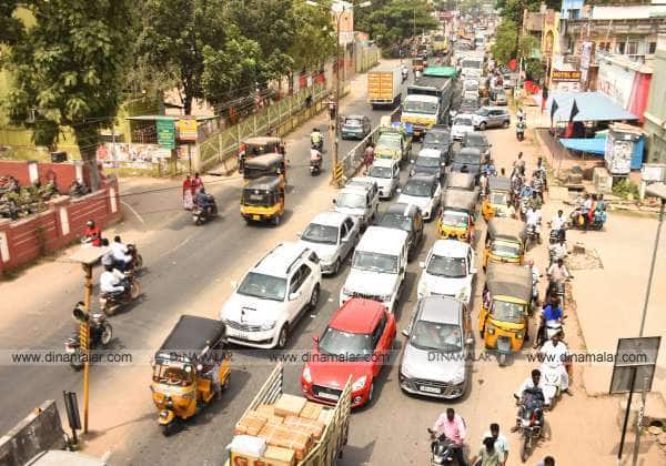 கடலூர் அண்ணா மேம்பாலத்தில் கட்டுப்பாட்டை இழந்து கவிழ்ந்த லாரியால் போக்குவரத்து பாதிக்கப்பட்டு நீண்ட வரிசையில் நின்று கொண்டு இருந்த வாகனங்கள்.